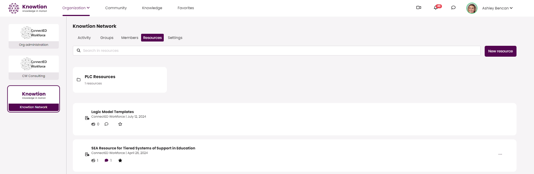 When your organization uses Knowtion to support and operationalize Professional Learning Communities (PLC)- they can share resources within and across Networks. You can access these resources by clicking on the RESOURCE Tab on the Organization Dashboard