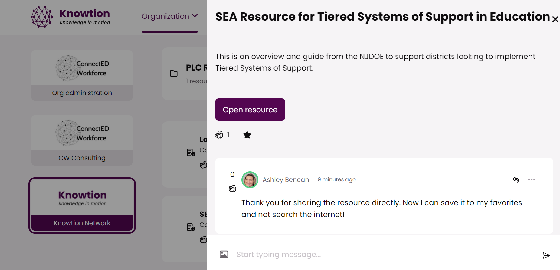 To open a resource, simply click on the title> click open resource. You can also share reactions, comments, questions or images specific to this resource.
